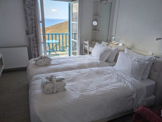 You will be staying in superior classic or superior modern rooms (bed size: double or twin beds) that present subtle, elegant, and modern comfort featuring state of the art facilities in a minimal Cycladic design mentality. All rooms have a balcony with a breathtaking view, handmade forged beds, classic line furniture, and designer linens. All rooms